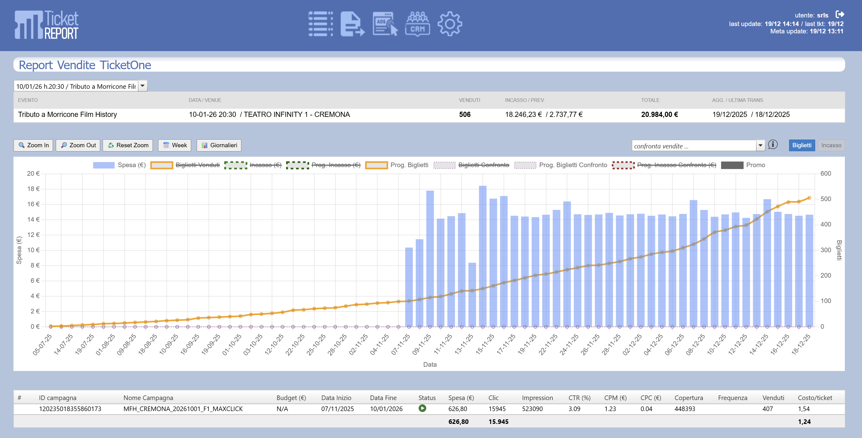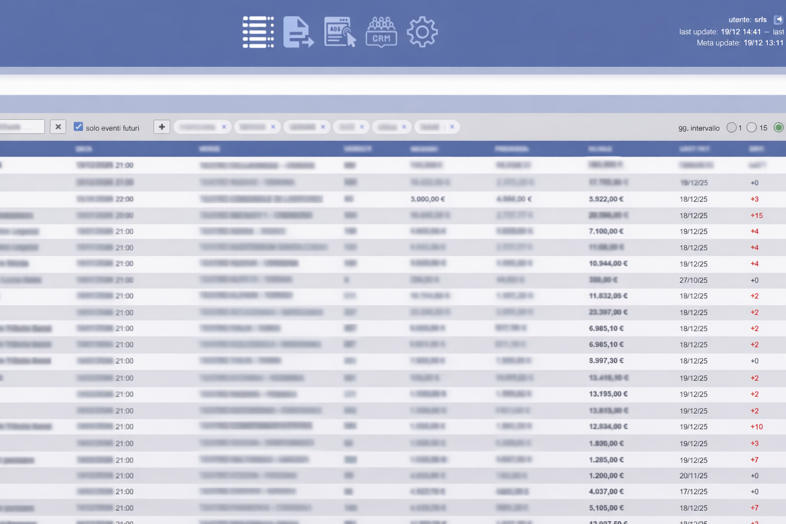 Un sistema unico che integra in tempo reale i dati di biglietteria, li visualizza in modo intuitivo con grafici e permette di collegarli alle tue campagne pubblicitarie.